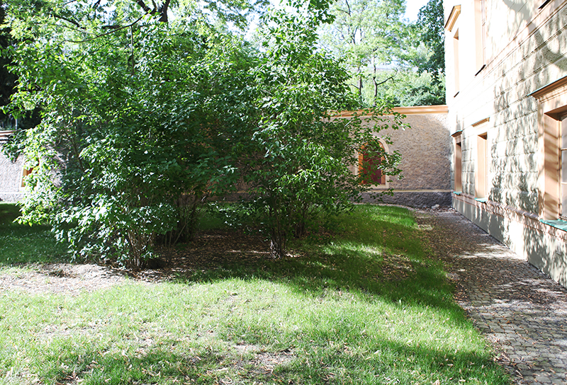 Vstupní část sadů z Rybalkovy ulice, napravo objekt bývalé Horní Landhausky